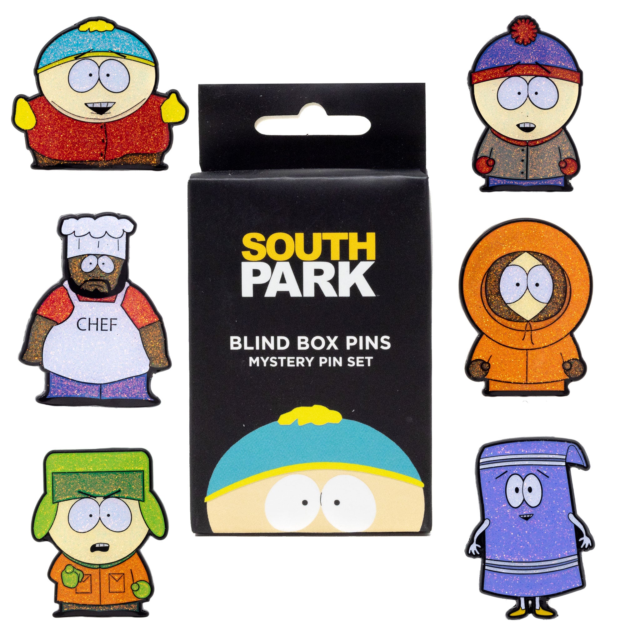 South Park Blind Box Glitter Enamel Pin Series - Mystery Character Cartman, Kyle, Chef, Kenny, Stan, or Towelie