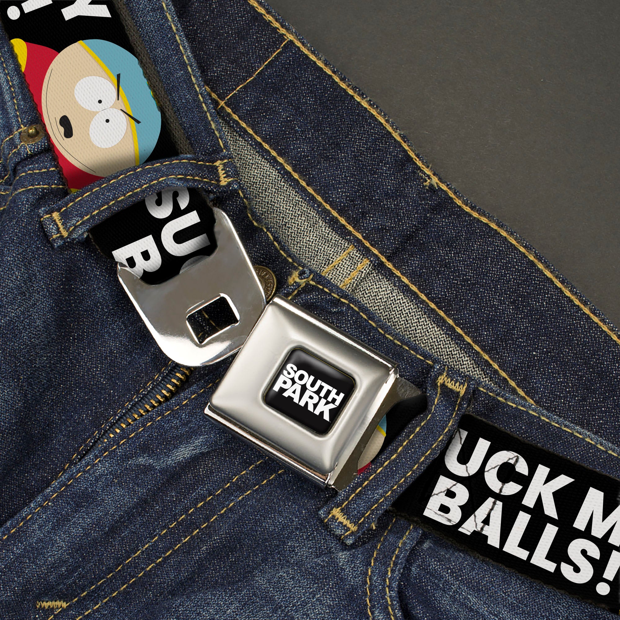 SOUTH PARK Title Logo Full Color Black/White Seatbelt Belt - South Park Cartman SUCK MY BALLS Pose Black/White Webbing