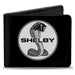 This awesome men's bi-fold wallet is made from premium vegan leather. It measures 4.0x3.5x0.5 Inches, and features the standard billfold, 5 card slots, and windowed ID holder. The logos are applied using advanced printing technologies, so the wallet will still look good after years of hard use. This product is made by Buckle-Down, Inc. and Officially Licensed by Carroll Shelby.