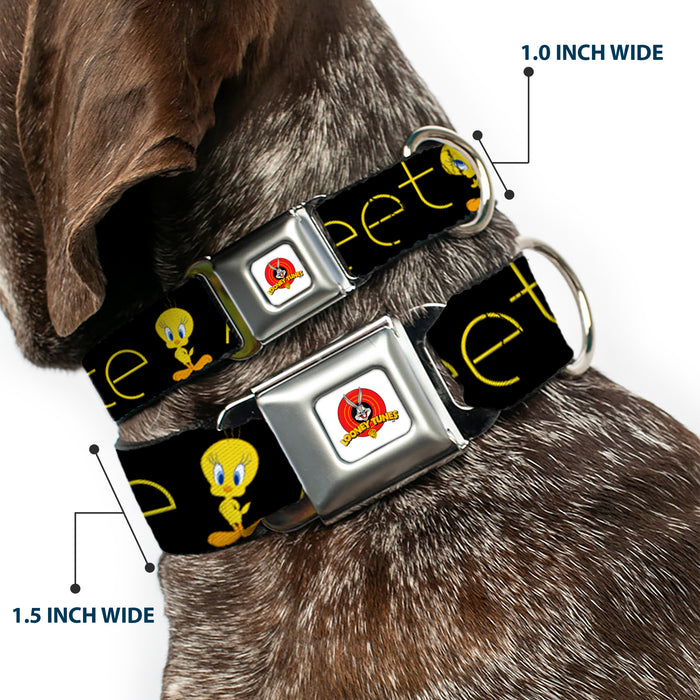 Looney Tunes Logo Full Color White Seatbelt Buckle Collar - Tweety Bird Poses CUTE AND SWEET Black/Yellow