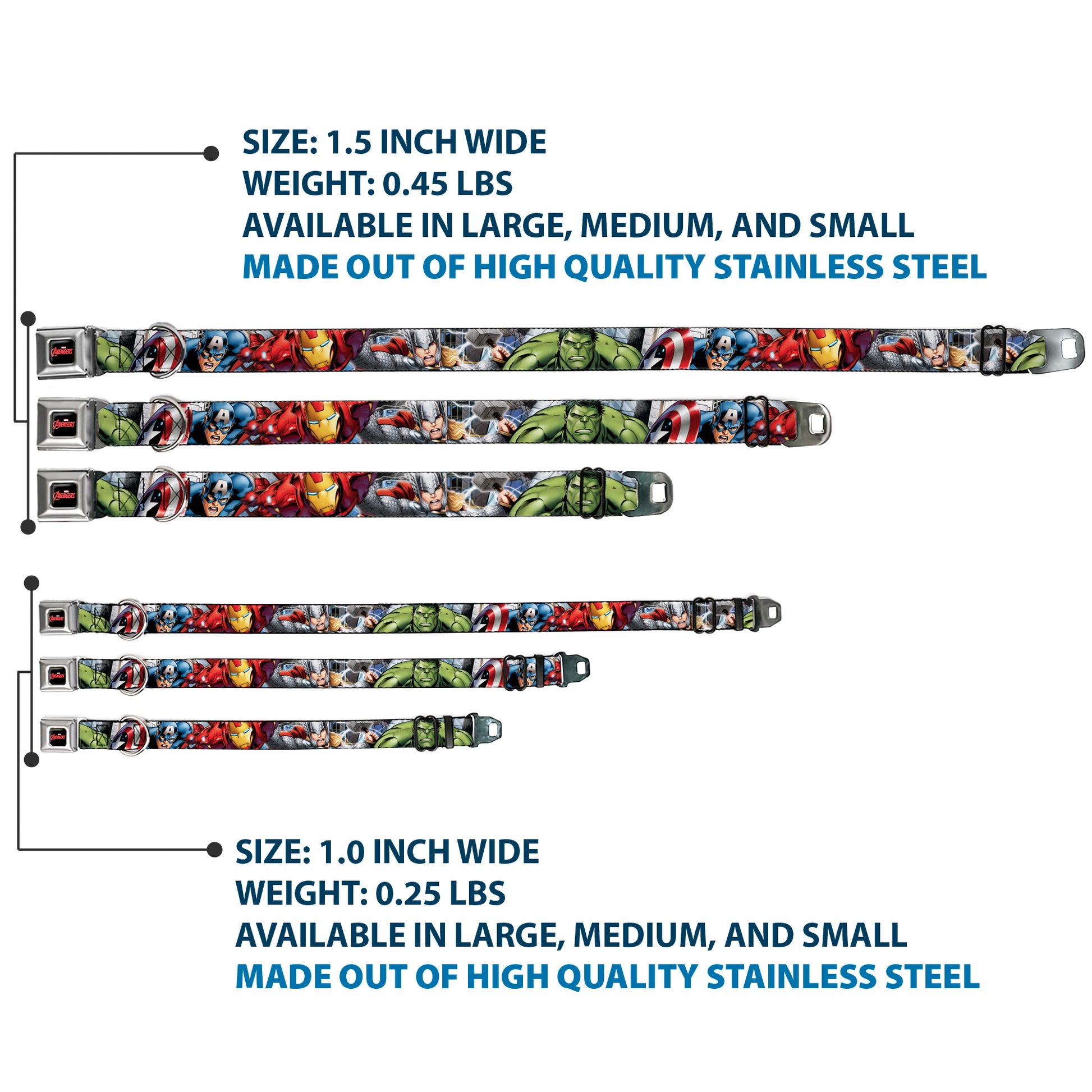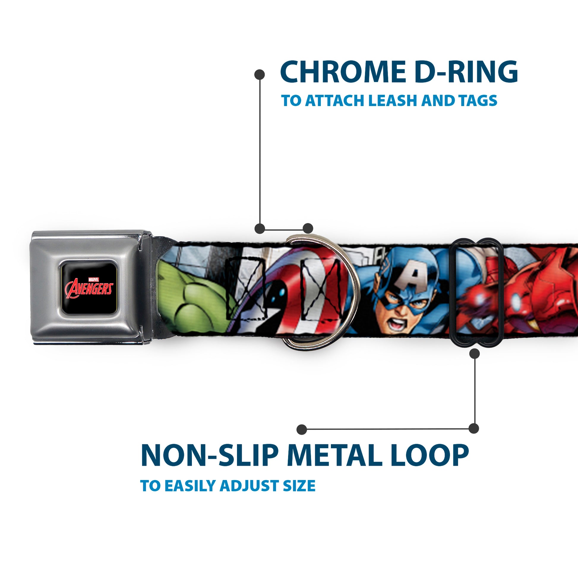 MARVEL AVENGERS Logo Full Color Black/Red/White Seatbelt Buckle Collar - Marvel Avengers 4-Superhero Poses CLOSE-UP