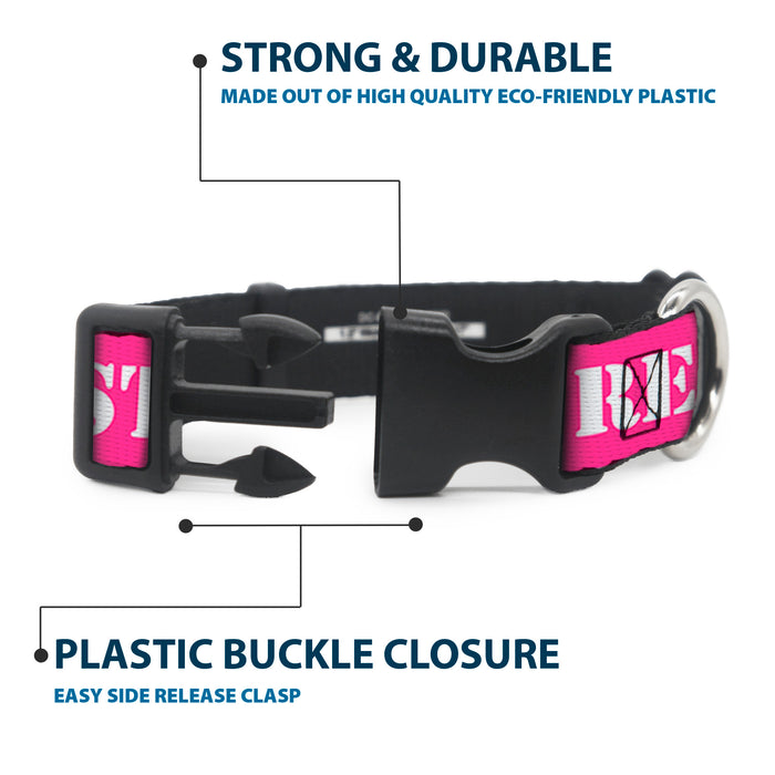 Vibrant and bold, this beautiful, polyester dog collar is made to show off your dog's unique style through all the seasons. With an overengineered plastic buckle and strong D-ring, this durable collar can hold up to whatever your dog can dish out. This product is officially licensed by Buckle-Down.