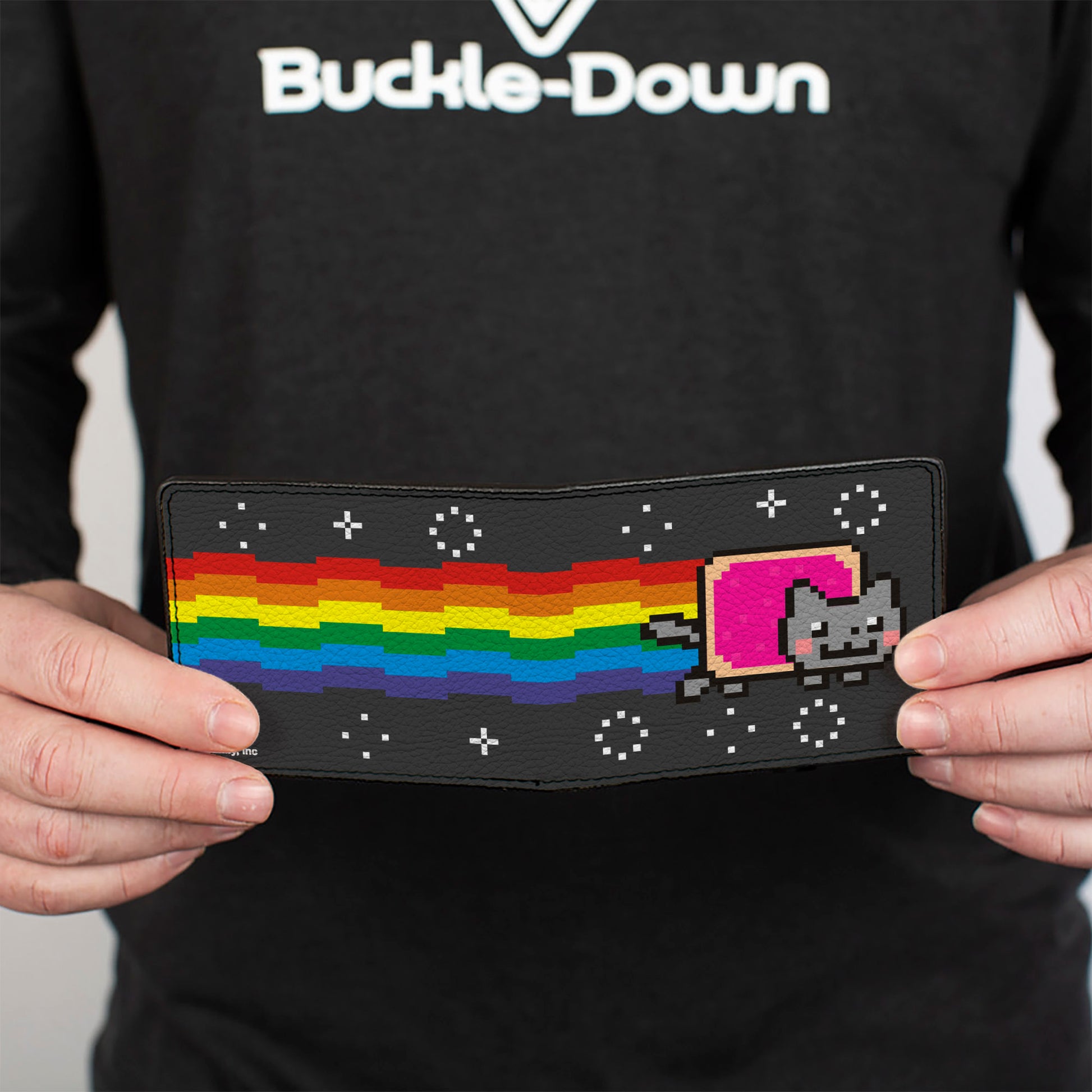 This awesome men's bi-fold wallet is made from premium vegan leather. It measures 4.0x3.5x0.5 Inches, and features the standard billfold, 5 card slots, and windowed ID holder. The logos are applied using advanced printing technologies, so the wallet will still look good after years of hard use. This product is assembled in the USA by Buckle-Down, Inc. and Officially Licensed by Nyan Cat.