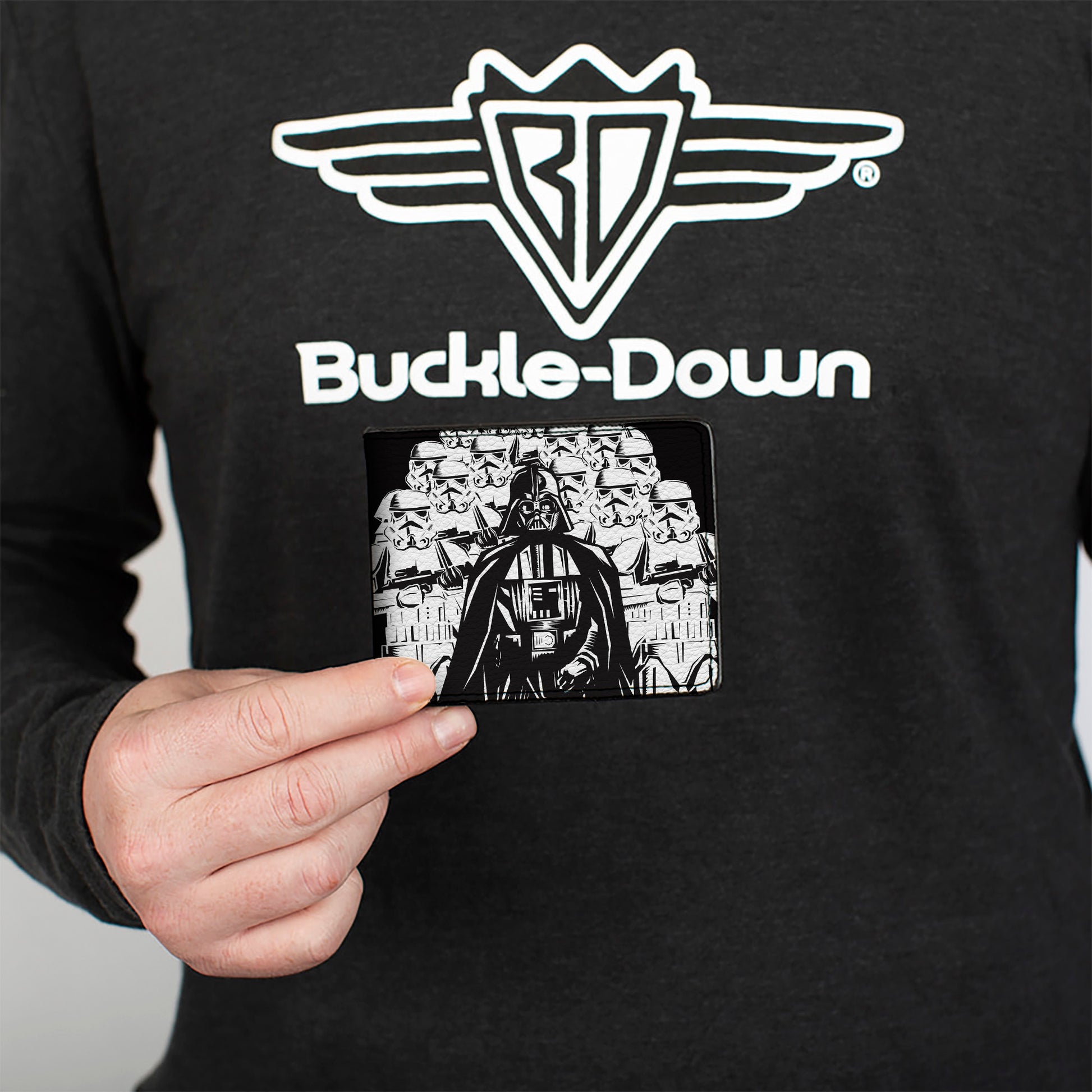 This awesome men's bi-fold wallet is made from premium vegan leather. It measures 4.0x3.5x0.5 Inches, and features the standard billfold, 5 card slots, and windowed ID holder. The logos are applied using advanced printing technologies, so the wallet will still look good after years of hard use. This product is assembled in the USA by Buckle-Down, Inc. and Officially Licensed by Lucasfilm Ltd.