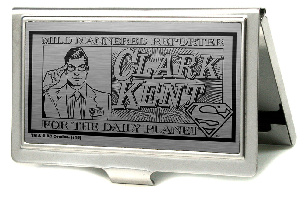 Business Card Holder - SMALL - CLARK KENT Pose MILD MANNERED REPORTER FOR THE DAILY PLANET Brushed Silver Black