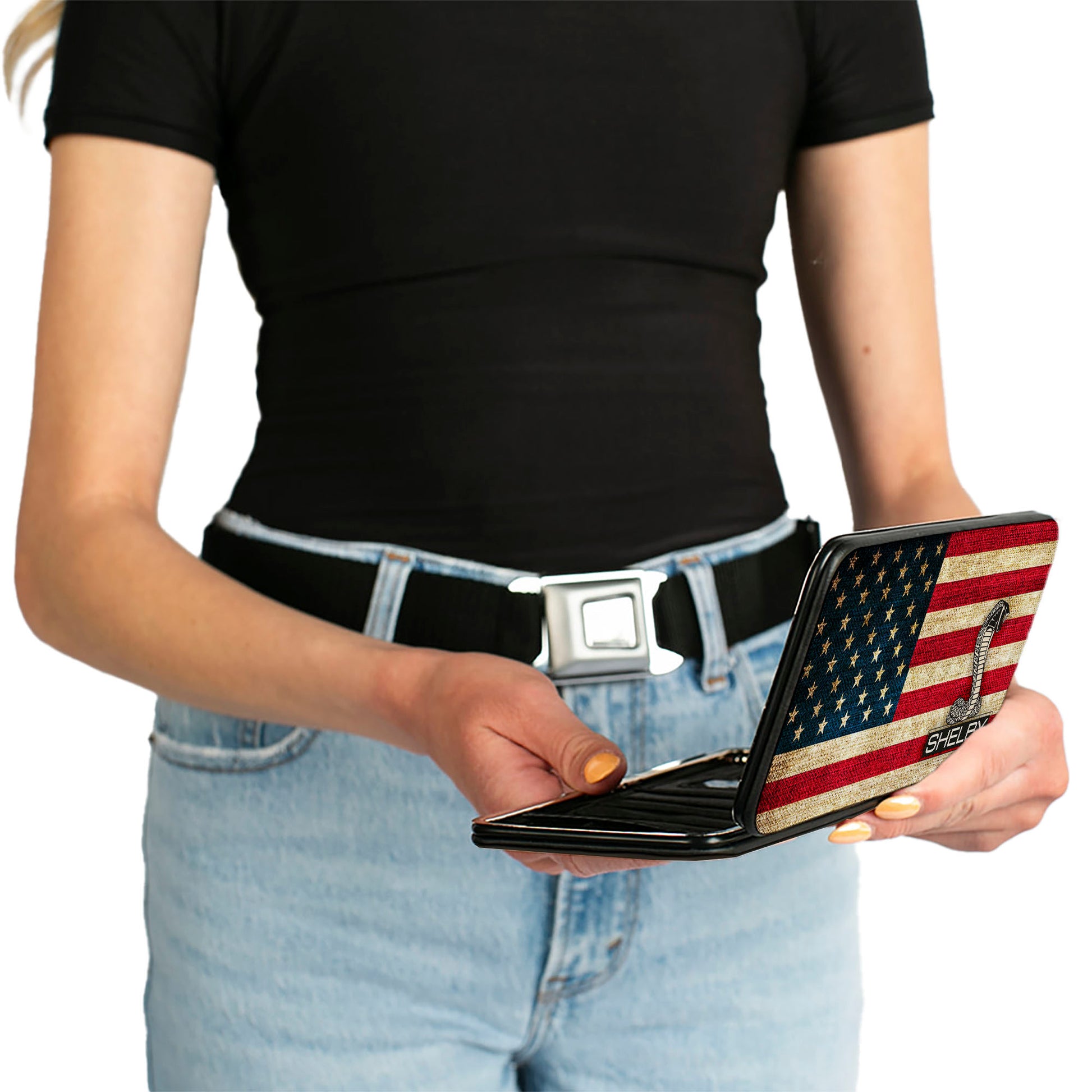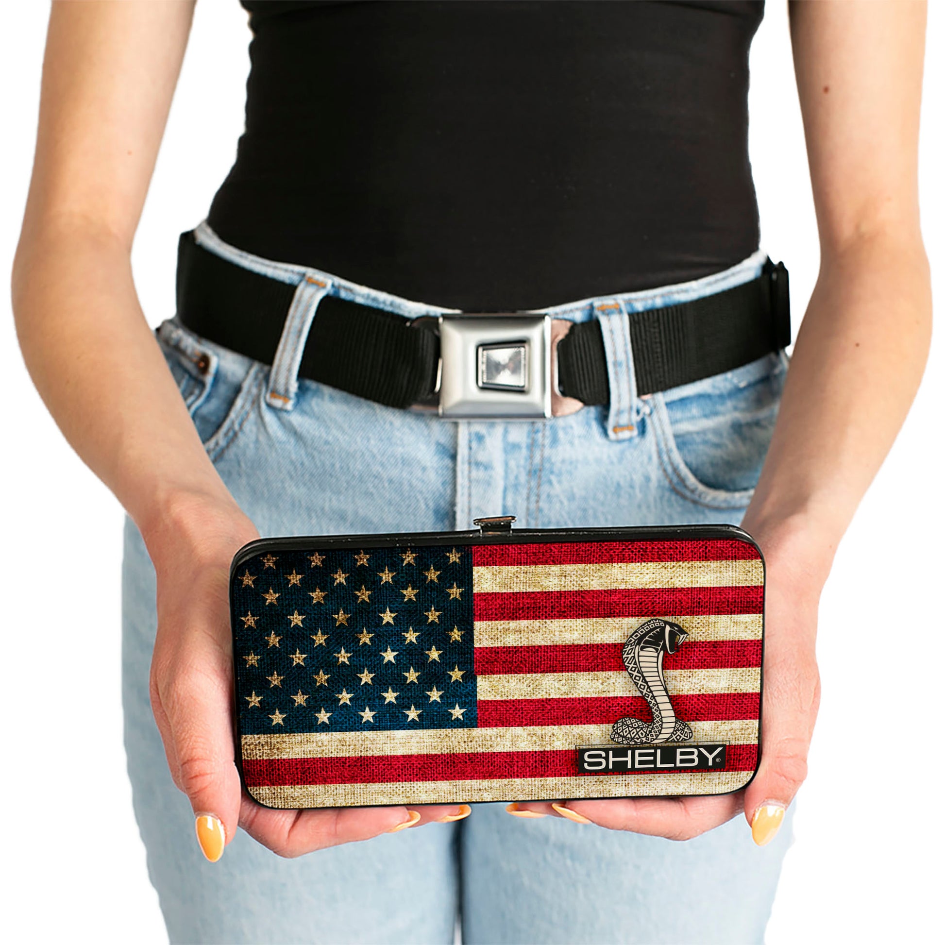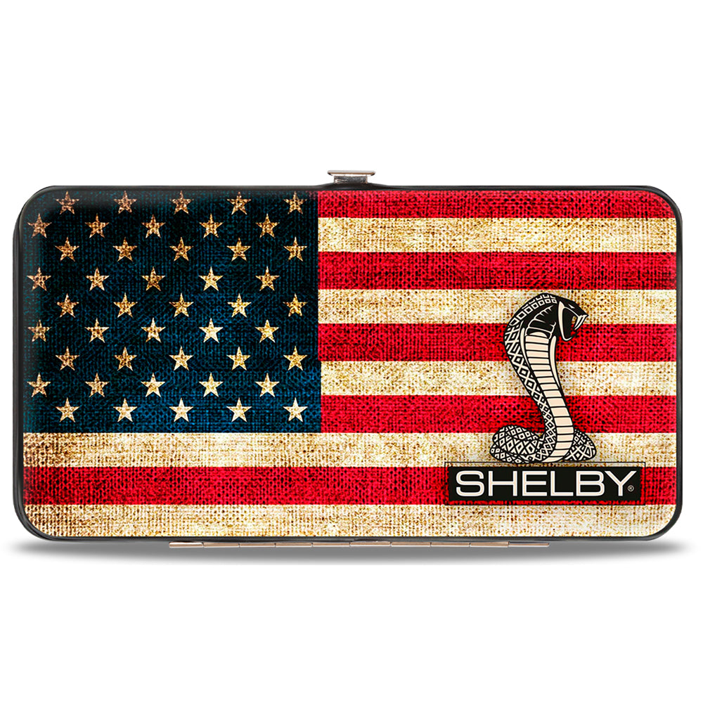 You're going to love this wallet! Stylish and sleek, this hinged wallet is made from vegan leather and stainless steel. It measures 7.0x4.0x0.75 Inches, with 2 billfolds, 4 card slots, and a windowed ID holder. The gorgeous artwork is applied using the latest printing technology, so it will hold up well over time. This product is Made in USA by Buckle-Down, Inc. and Officially Licensed by Carroll Shelby.