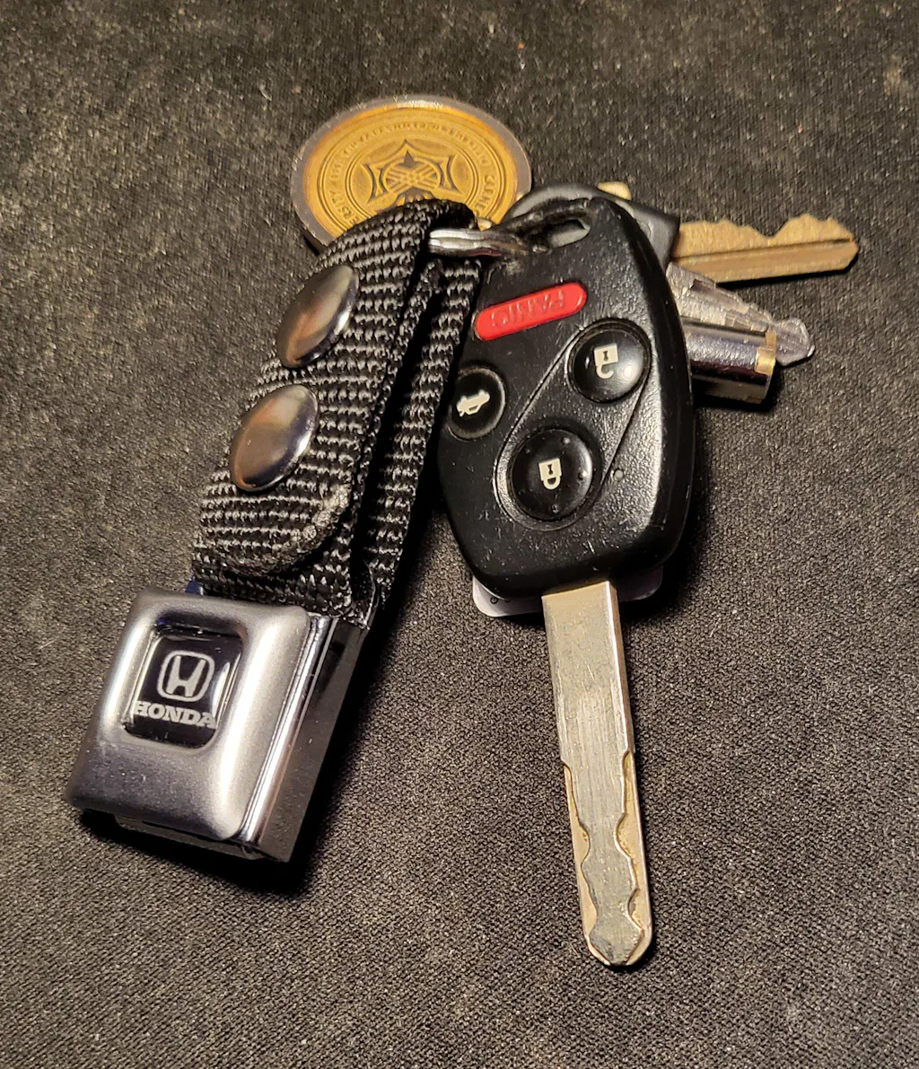 - This nifty keychain is equipped with an authentic SeatBelt Buckle clasp.