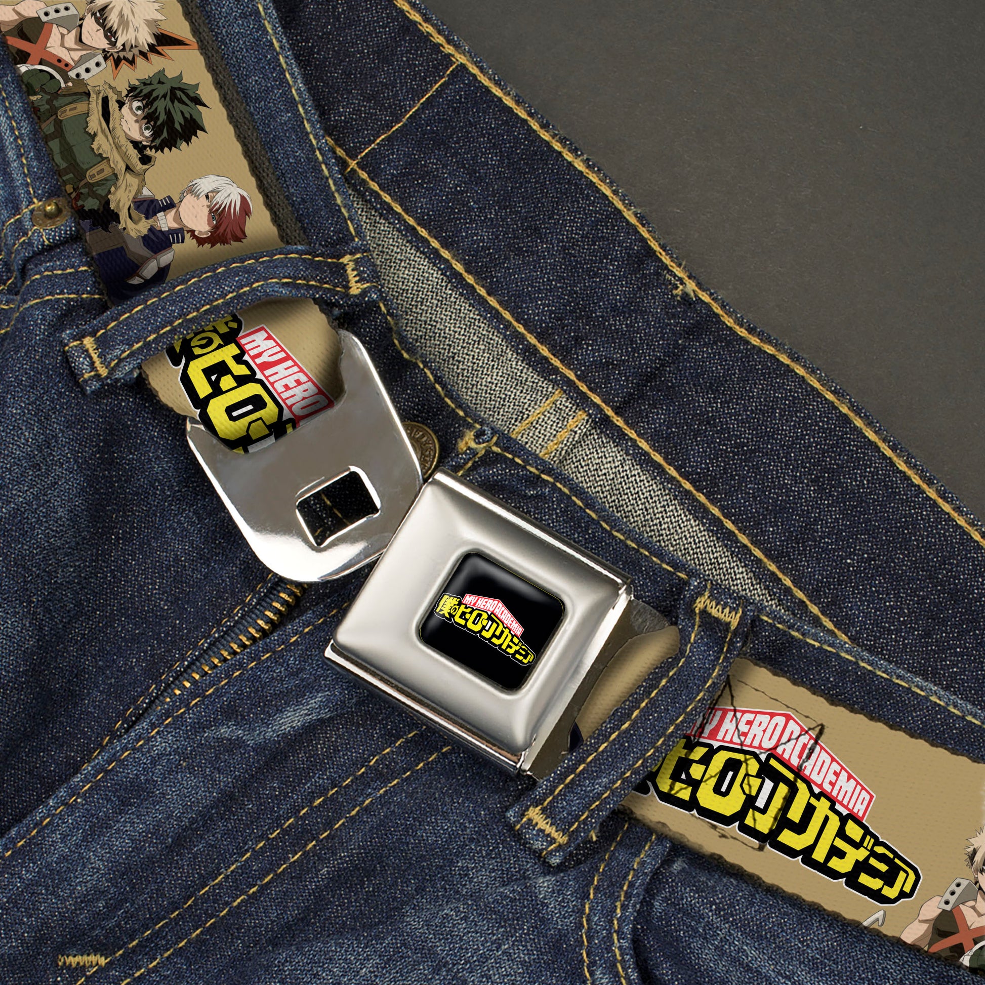 MY HERO ACADEMIA Title Logo Full Color Black Seatbelt Belt - MY HERO ACADEMIA Character Trio Pose and Title Logo Tan Webbing
