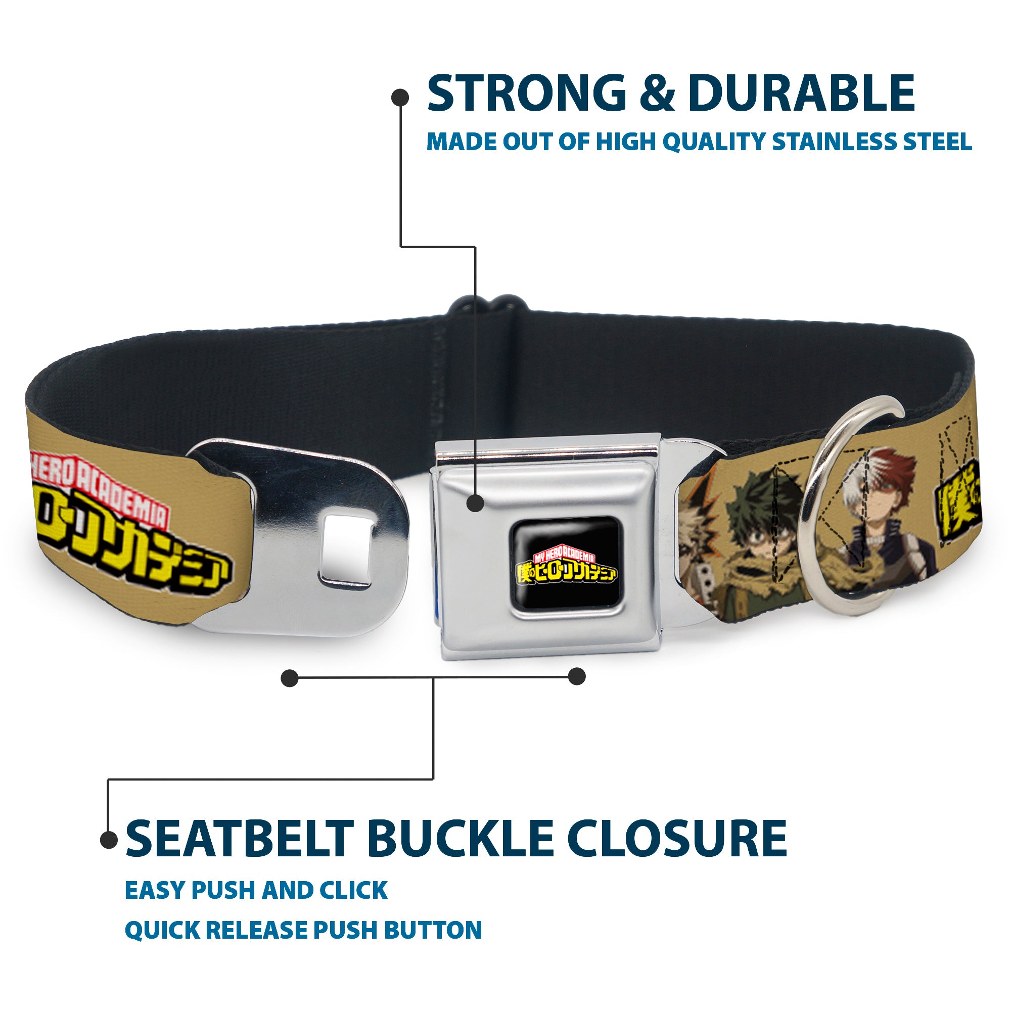 MY HERO ACADEMIA Title Logo Full Color Black Seatbelt Buckle Collar - MY HERO ACADEMIA Character Trio Pose and Title Logo Tan