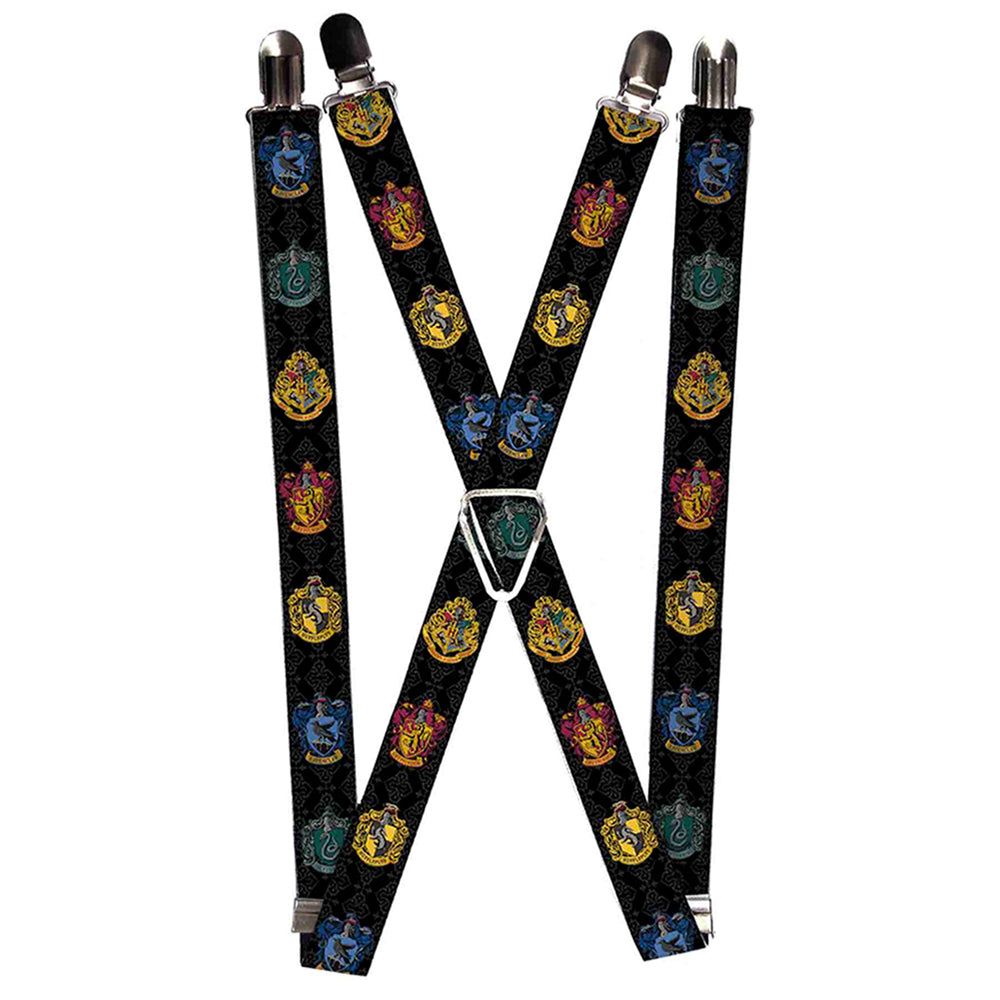 Suspenders - 1.0" - Hogwarts & 4-House Crests Filigree Black Gray