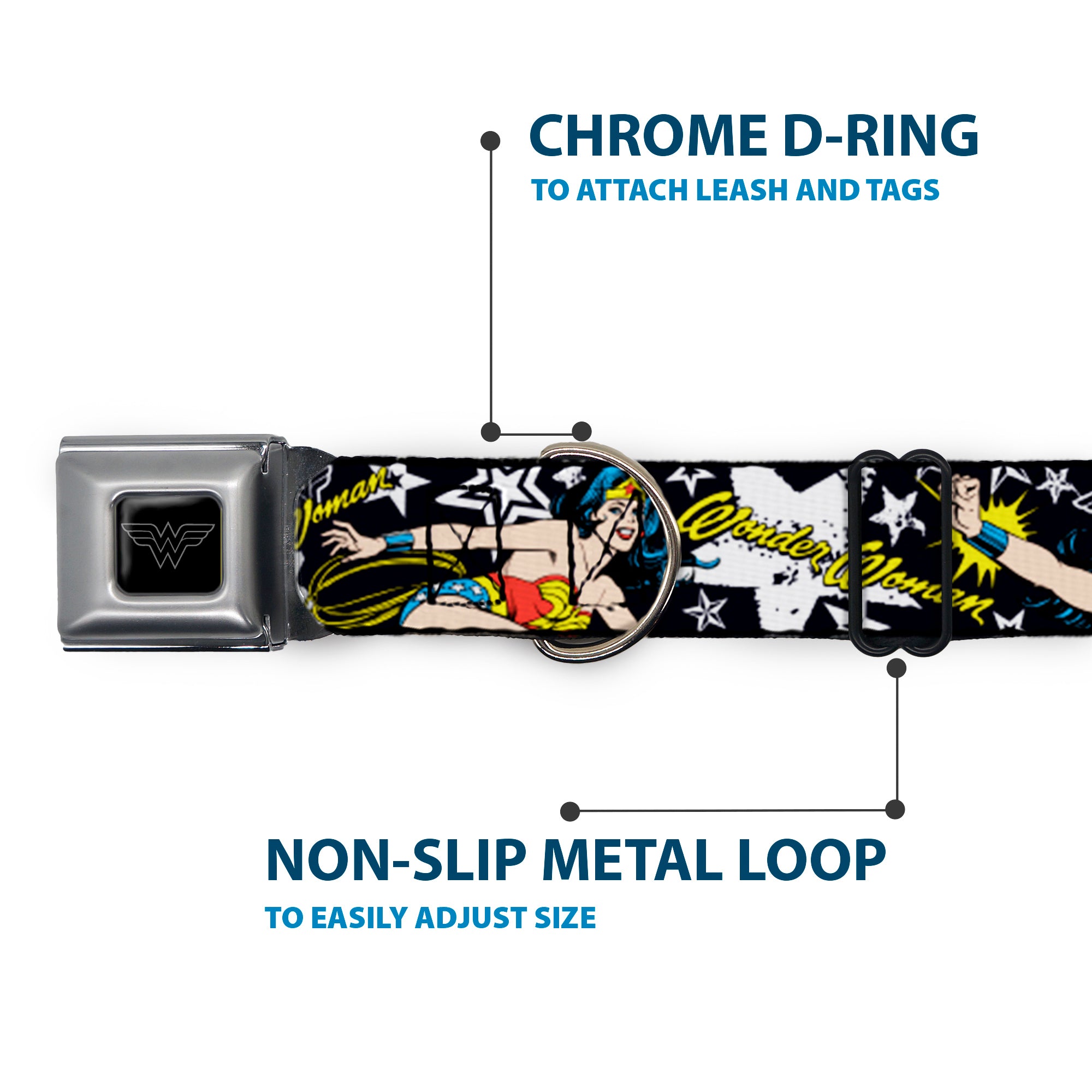 Wonder Woman Black Silver Seatbelt Buckle Collar - Wonder Woman/Stars Black/White